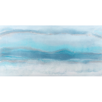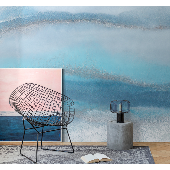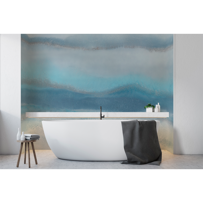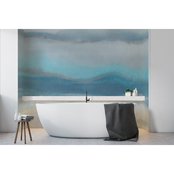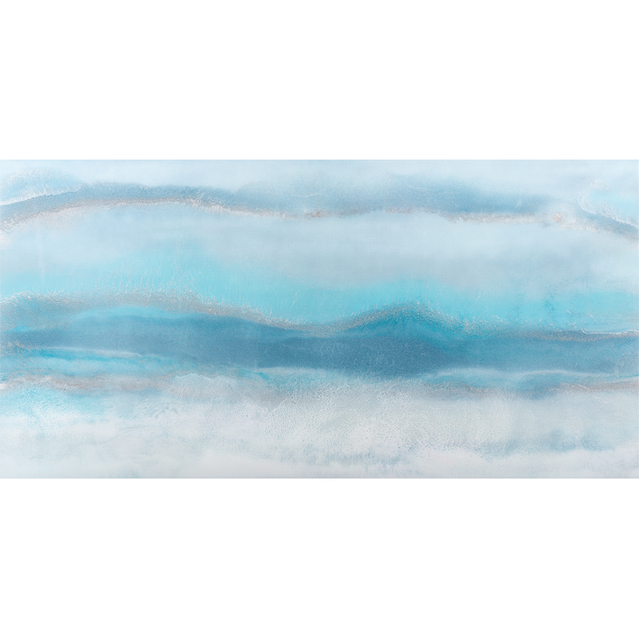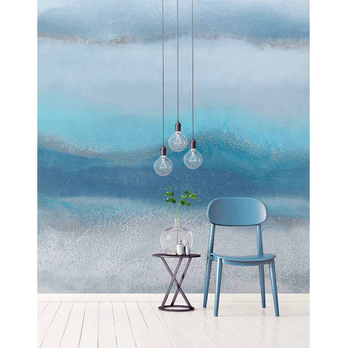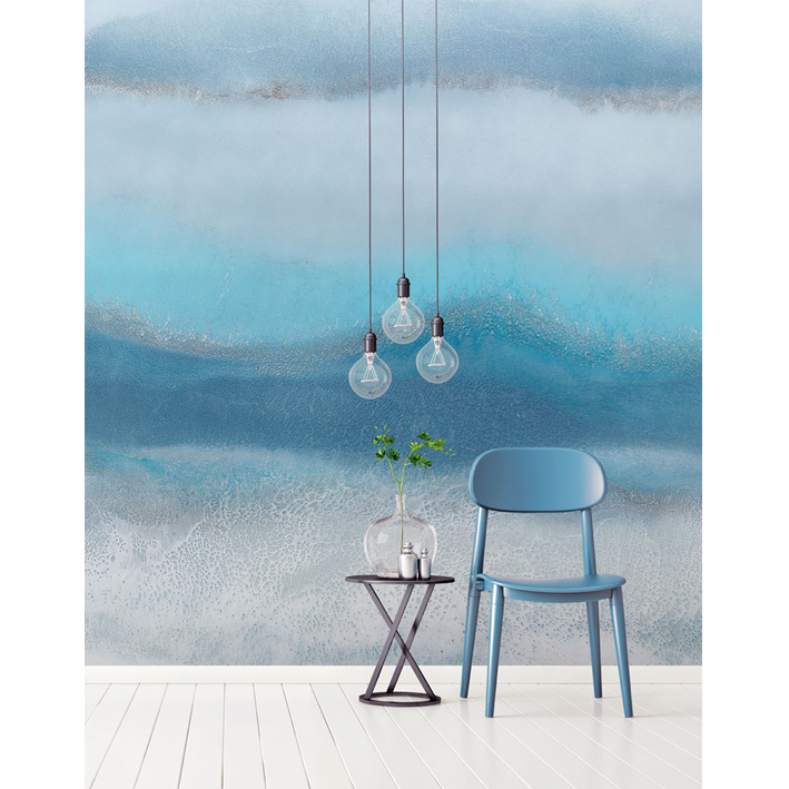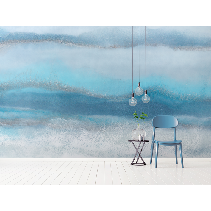 This modern, glossy, seascape wallpaper mural, originally painted as a resin artwork layered with soft blue hues and silver metallic pigments. Shimmering iridescent mica powder was added to the original artwork to create a hint of sparkle in the foamy white waves. A cool toned color palette was used to create this serene, multi-dimensional seascape.