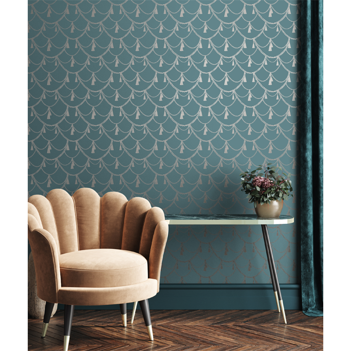 This teal & silver romantic pattern wallpaper mural offers elegance and romance through inspiration of a private lady’s dressing room from the Victorian era. The Boudoir wallpaper features detailed chains, tassels, and ropes in metallic hues that complement the background for a bedroom or powder room.