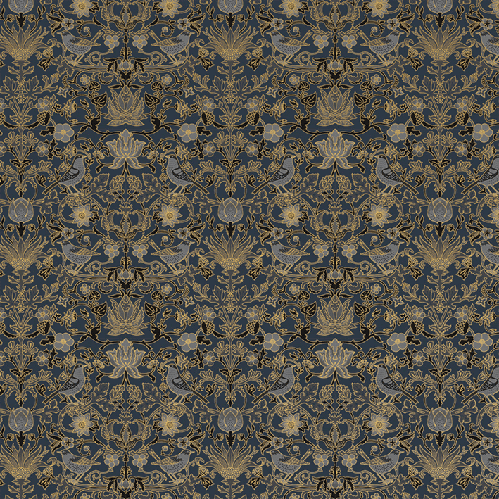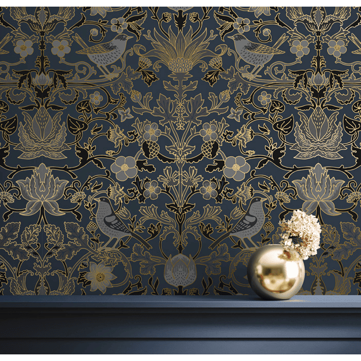The Casterbridge floral pattern wallpaper mural harnesses the celebrated Arts and Crafts movement, whilst adding a dash of modern metallic glamour. Rich foliage is interspersed with delicate floral blooms that form an elegant background wallpaper pattern in which perches exquisite birds. The rich pattern of this wallpaper draws the eye into the design in an intricate yet harmonious scene. And as a luxurious final touch, each branch is adorned with a sumptuous metallic gleam to showcase its rich pattern.