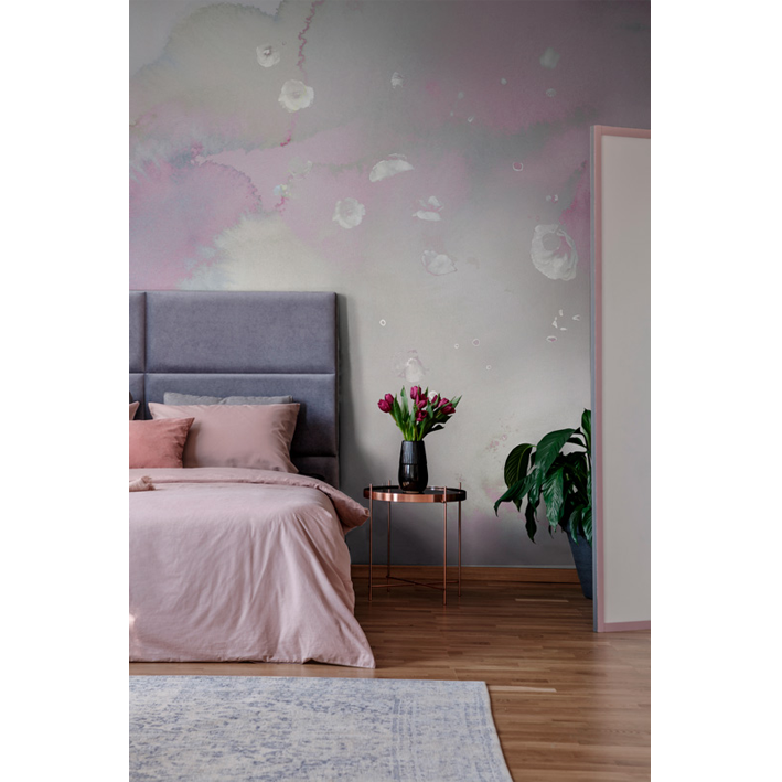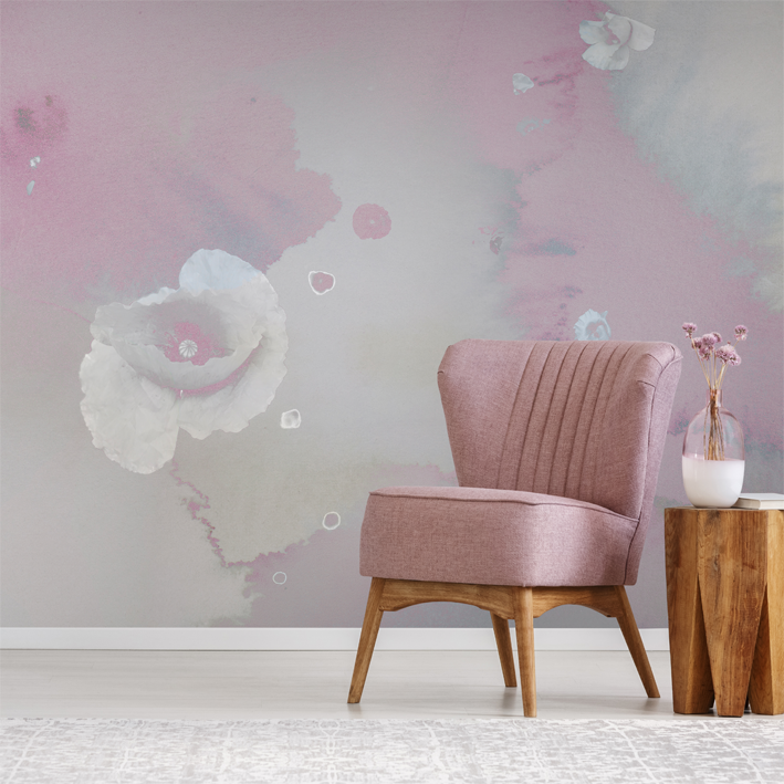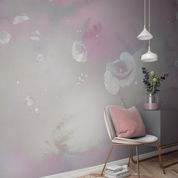 This stunning wall mural celebrates the elegance and beauty of the natural world by interlacing floral and cloud motifs. Artist Miriam Stayte has created a delicate pastel watercolour backdrop that projects us upwards into the nebulous skies, whilst delicate silver toned poppies rain downwards. Combining this pink & white floral cloud wall mural with coordinating soft furnishings in your living room will create a stunning contemporary pink interior.