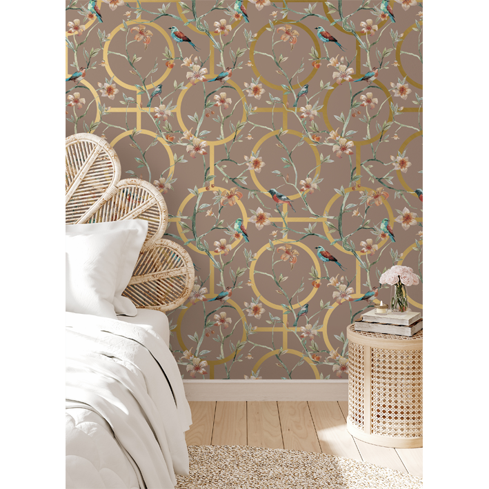 Show off your love of nature and the outdoors when you hang this brown & gold luxury floral geometric wallpaper in any room of the home. The bedroom wallpaper has a calming and elegant design with birds on perches with vines and flowers crawling across the geometric patterns. It can be used as a covering for the entire room or as a unique accent wall to increase visual appeal in a space.