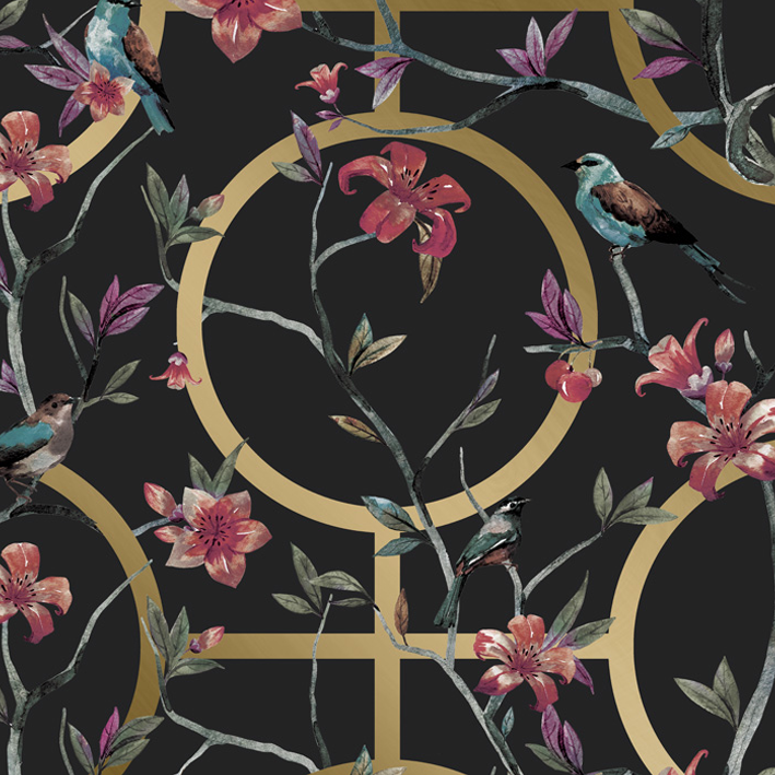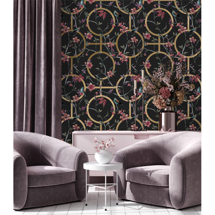 Brimming with life and natural beauty, this grey & gold luxury floral geometric wallpaper will make any room the focal point of the home. The designer wallpaper incorporates geometric designs against a dark grey background with birds, flowers, and other foliage climbing on the shapes. Apply to one wall for an enchanting feature wall or enclose the room in the wonders of nature.