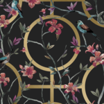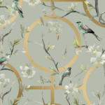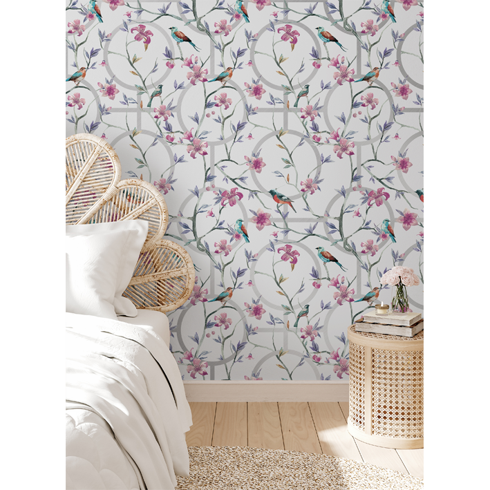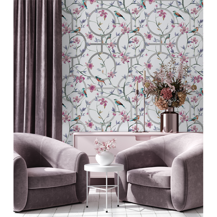 Created with light and beautiful colours, this grey & silver luxury floral geometric wallpaper has an understated beauty for use in a modern home. It can be used as kitchen, dining room, or bedroom wallpaper to add extra colour to the space. The wallpaper pictures several birds amongst the blooms and leaves of flowers with a white backdrop and several geometric objects.