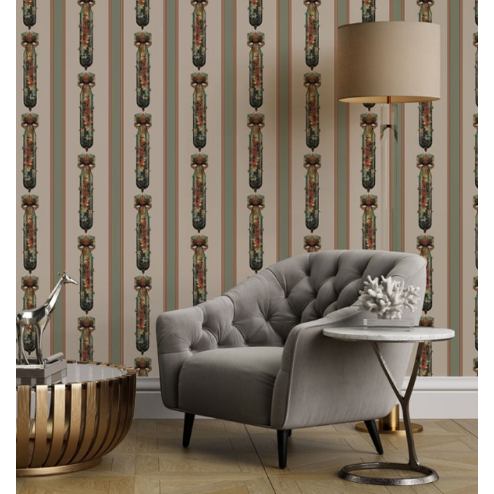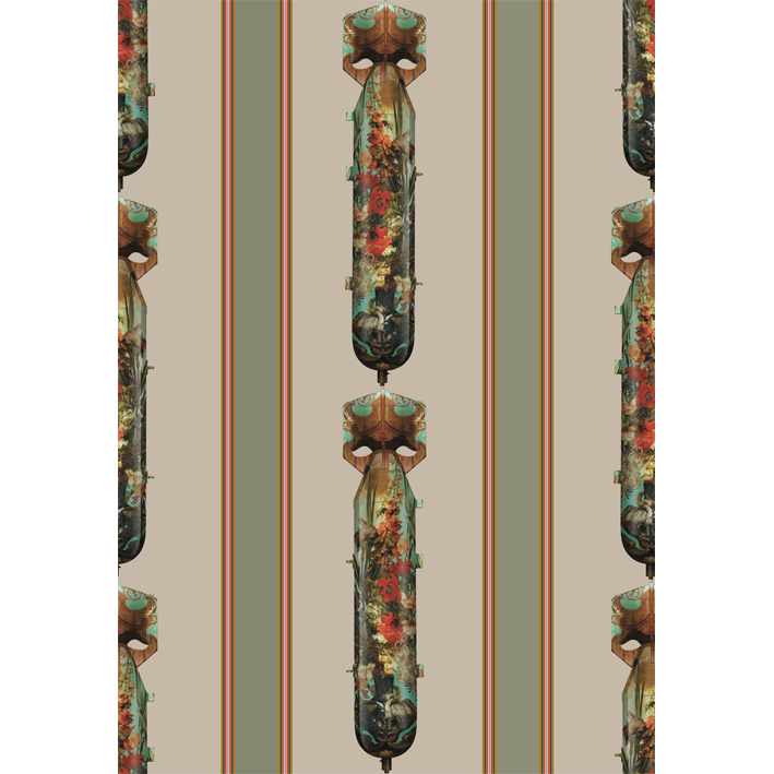 Flower Bomb wallpaper takes a formal Georgian striped design and add a touch of humour and complexity into the mix. The larger stripes of the cream flower bomb wallpaper feature a stylized bomb against a tranquil background as a way of showing how extremes often occur simultaneously in human existence.x