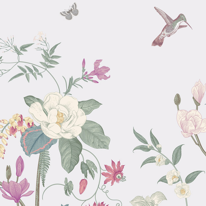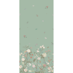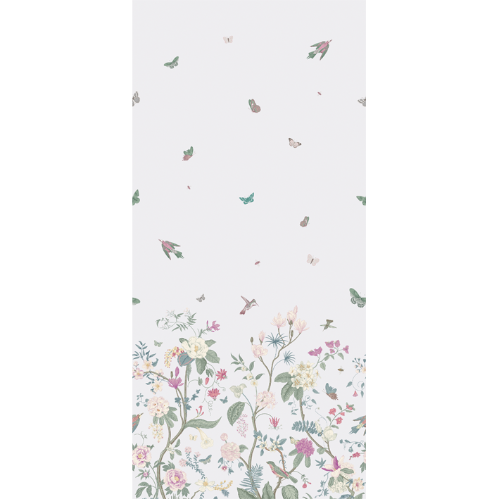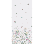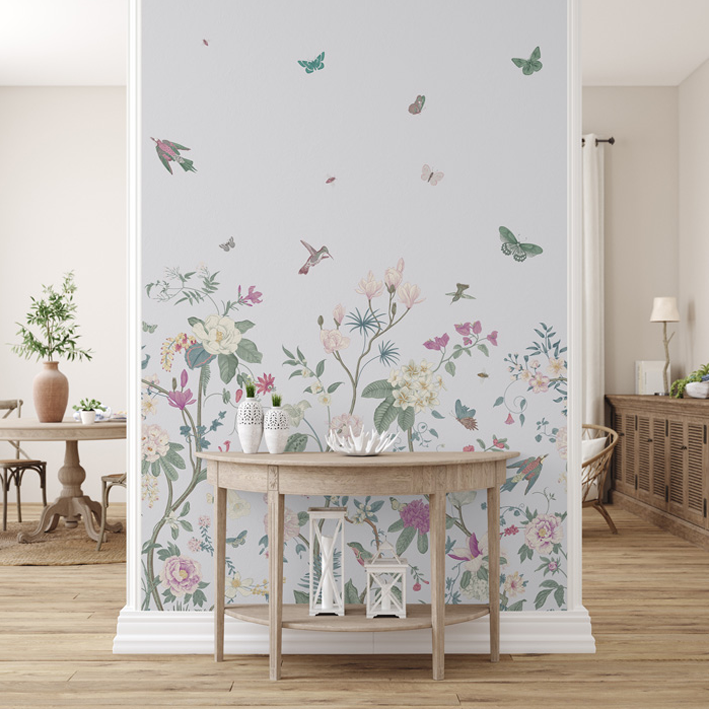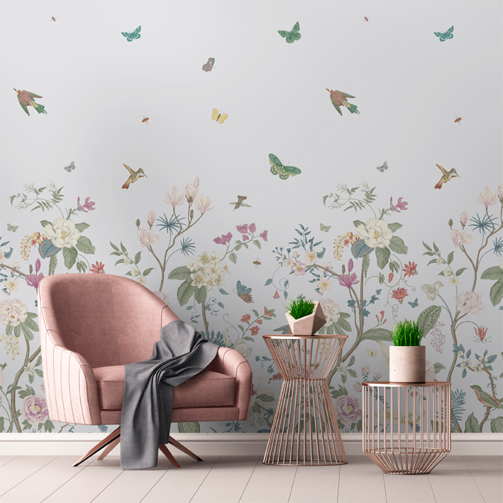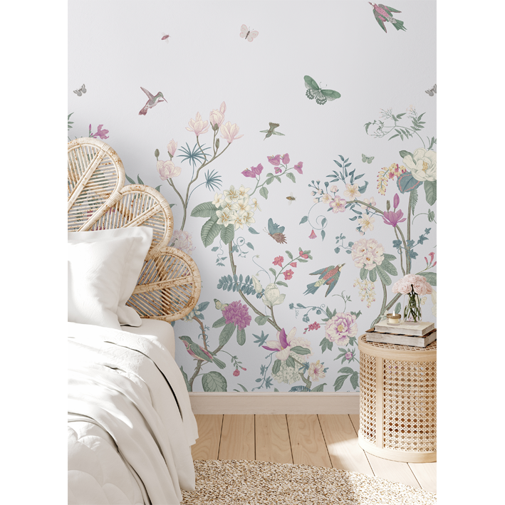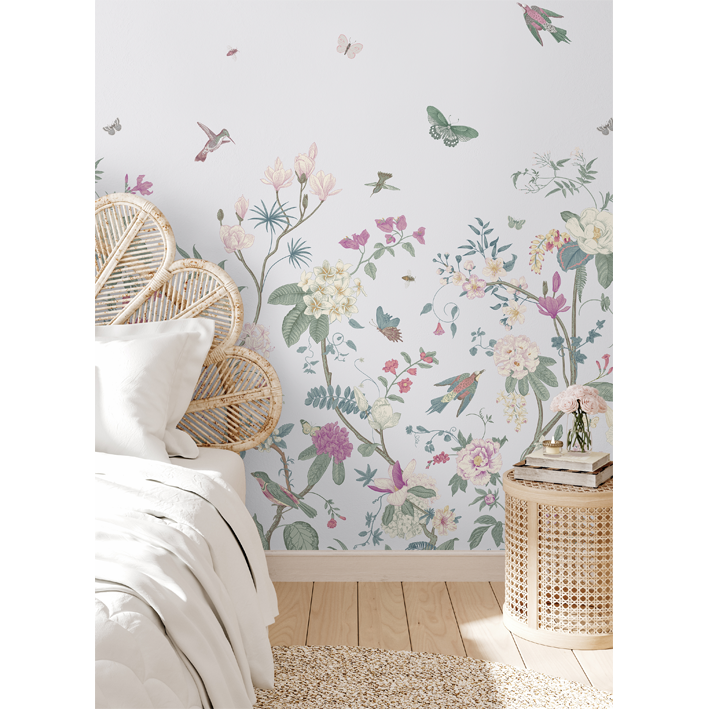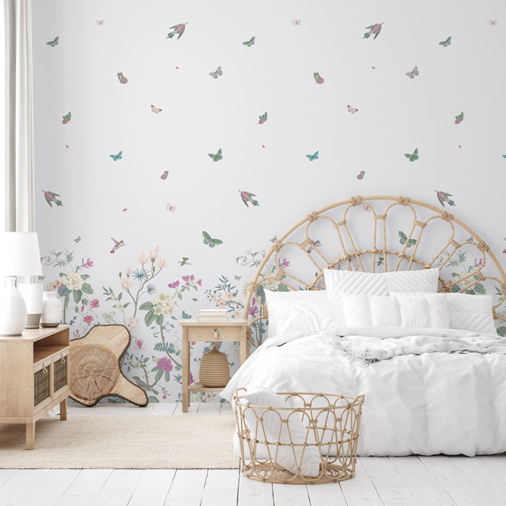 Multiple pops of colour create a beautiful space when it’s adorned with white butterfly floral wallpaper. The backdrop is a simple white that evokes peacefulness and innocence for a child’s room. Flowers of all types and colours grow out of the bottom of the luxury wallpaper, while the top features flying animals and insects enjoying the pleasures of life on earth.