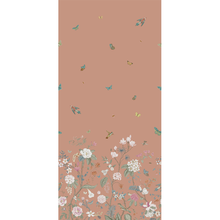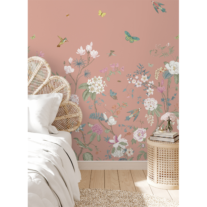 Shades from the entire spectrum of the rainbow come together in this pink butterfly floral wallpaper. It has a fanciful and playful feel with small creatures flying through the air and lighting atop flowers across the surface of the wallpaper. As a modern wallpaper, it has beautiful artistry and could be the ideal choice for adding colour and animal companions to a nursery or playroom for kids.