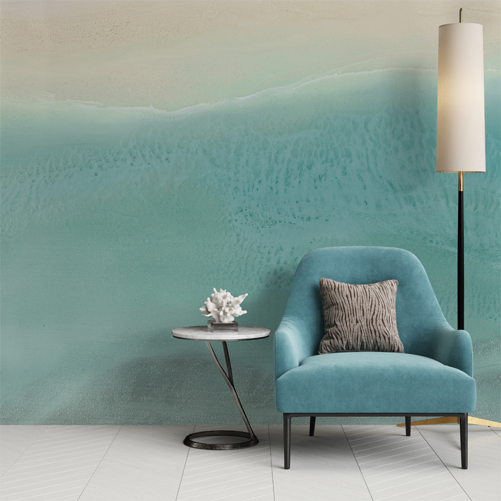 This ocean-inspired seascape wallpaper mural is layered with soft hues of aqua and white pigments. A cool-toned color palette was used to create this serene, modern, multi-dimensional painting. In the original artwork, hints of sparkle can be found in the soft washes of white foamy waves near the shore.