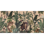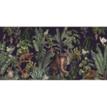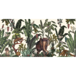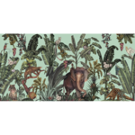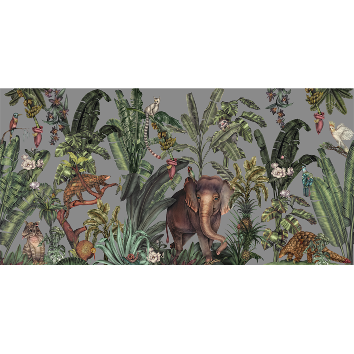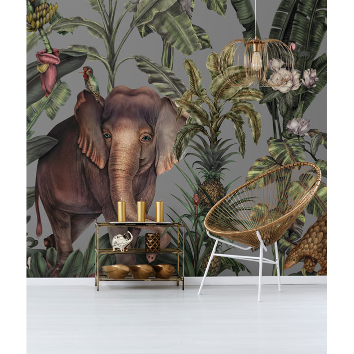 Created by artist Karina Eibatova, the Jungle Kingdom wallpaper opens a children’s bedroom or other room to the wonders of the jungle. This grey & green tropical elephant wallpaper mural includes stunning renditions of lemurs, elephants, pangolins, and other animals to create a place of imagination and joy.