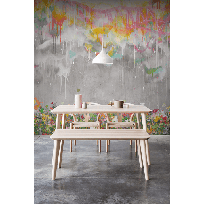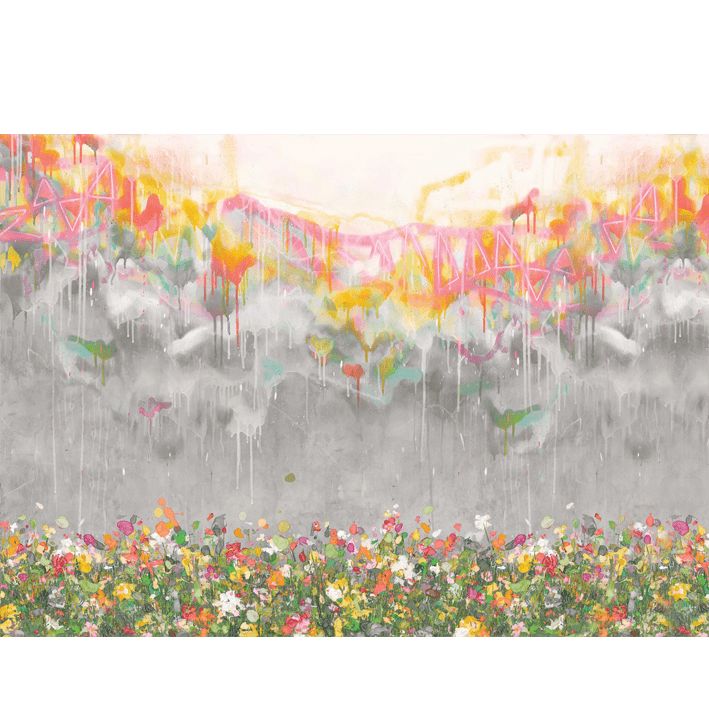 Glowing Shards wallpaper was designed by British painter Lee Herring who uses his trademark techniques with markers, acrylics, and spray paints to create layers of stunning textures. This grey & multicolour graffiti flower wallpaper mural blends modern graffiti with traditional florals for the perfect centrepiece.