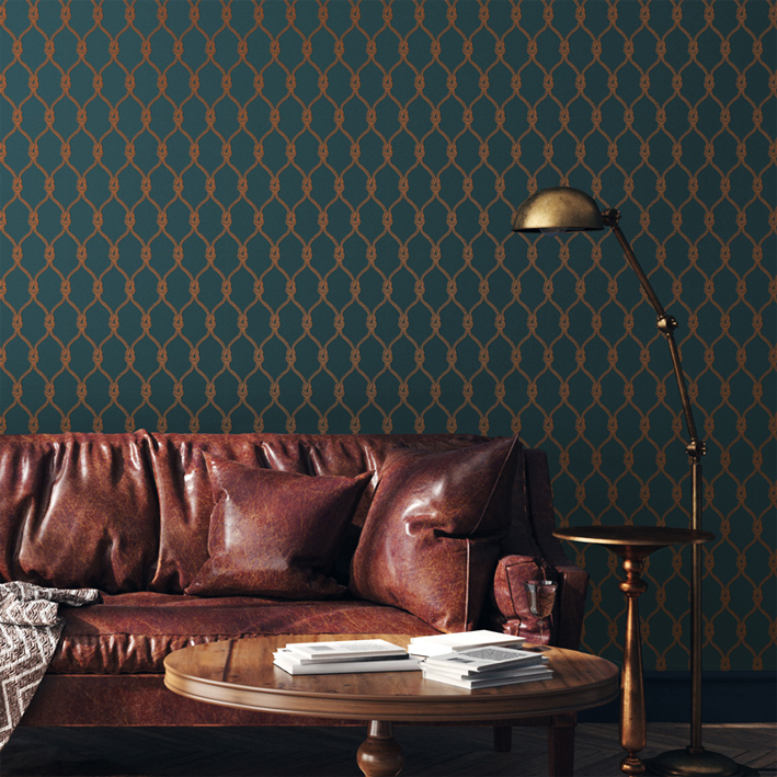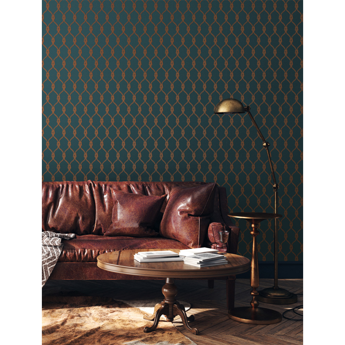 Mansfield is a classic Victoriana vintage trellis wallpaper mural featuring an elegant lattice work of cordage and lacing resulting in a harmonious geometric wallpaper. The cabled rope has a metallic brilliance to accentuate its fine meshwork against the restrained background tones. This design has the captivating mix of intricate detail when viewed up close combined with the impactful statement of the repeating formal pattern when viewed from afar. Choose from five stunning background hues that beautifully complement the burnished rope lattice.