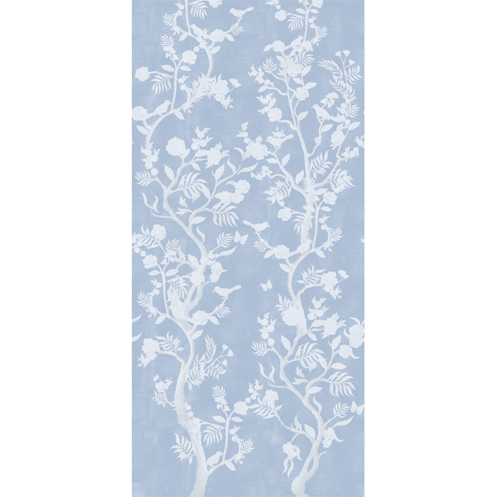This white Chinoiserie bird wallpaper, part of our “Matsumoto” collection features a host of details to create an elegant and luxurious atmosphere in any room. The Matsumoto wallpaper offers a pale blue background with a foreground in white and grey that incorporates exotic white birds resting on or near the chinoiserie-style boughs.