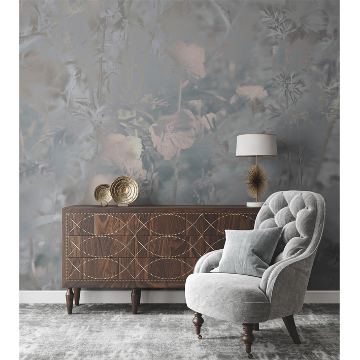 Flowers cross in front of each other in hues of blue and pink when gazing upon Meadow Geranium. This is a pink & blue meadow flower wall mural that takes a traditional style and adds a touch of the abstract to bring it into the modern world. The flower leaves add lightness to the space while the background complements contemporary furniture.