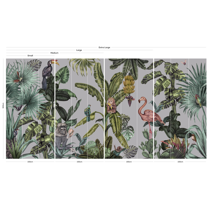 Explore this luscious tropical wallpaper mural, created by artist Karina Eibatova. Amongst the palm fronds and exotics flowers you’ll find delightfully detailed illustrations of hornbill birds, monkeys, flamingos and all manner of exotic flora and fauna.