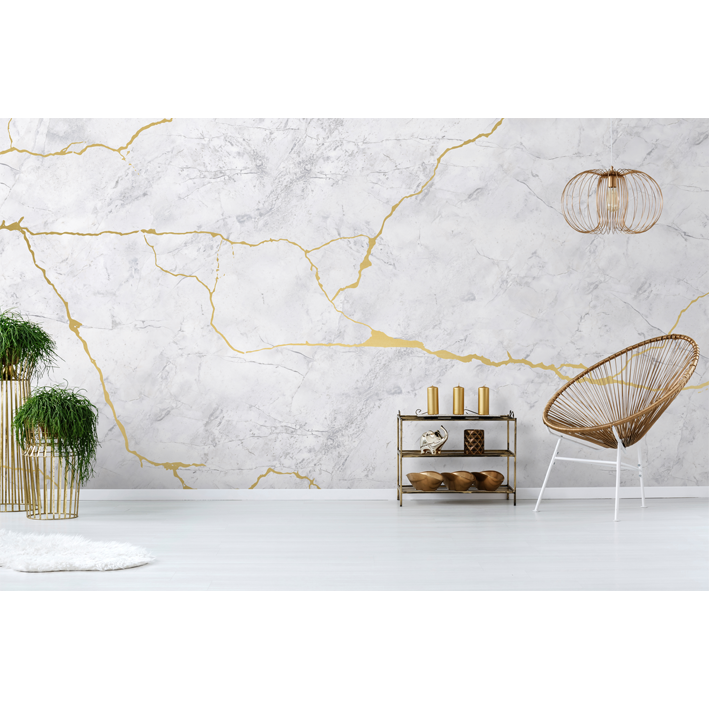 Kintsugi is the Japanese art of repairing broken pottery by mending the areas of breakage with golden lacquer: a concept applied with stunning effect in the Nero white and gold marble wallpaper mural. Subtle cracks and fine detailing permeate the whole design, juxtaposed with the gold metallic wallpaper, lifting the pared back colour scheme into design that works as a luxurious and beautiful wallpaper for any room in the home.