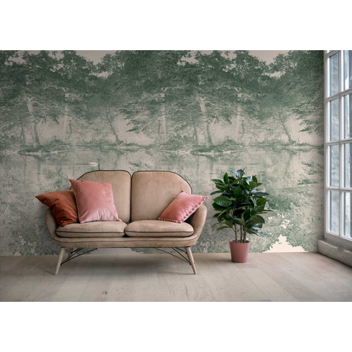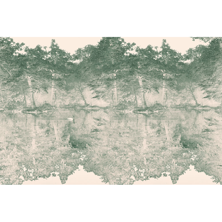 Swan Vert is a work by London artist Hugh Hamshaw Thomas. The original artwork is based on a photograph taken on the edge of lake landscaped by Humphry Repton (1752-1818). The artwork presents itself as if it were a piece of wallpaper or fabric in the Toile de Jouy style – seemingly of a similar period to the work undertaken by Repton. By presenting the image duplicitously as a photograph in a style belonging to the decorative arts, Hamshaw Thomas fuses themes of romantic melancholia, the bucolic and Arcadian with his interest in layering of histories, narratives and remembrance.