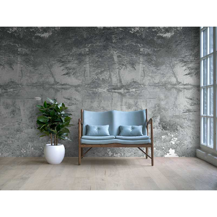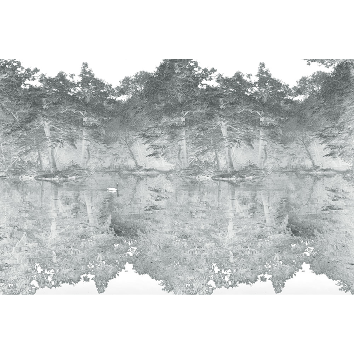 Swan Mist Grey is a work by London artist Hugh Hamshaw Thomas. The original artwork is based on a photograph taken on the edge of lake landscaped by Humphry Repton (1752-1818). The artwork presents itself as if it were a piece of wallpaper or fabric in the Toile de Jouy style – seemingly of a similar period to the work undertaken by Repton. By presenting the image duplicitously as a photograph in a style belonging to the decorative arts, Hamshaw Thomas fuses themes of romantic melancholia, the bucolic and Arcadian with his interest in layering of histories, narratives and remembrance.