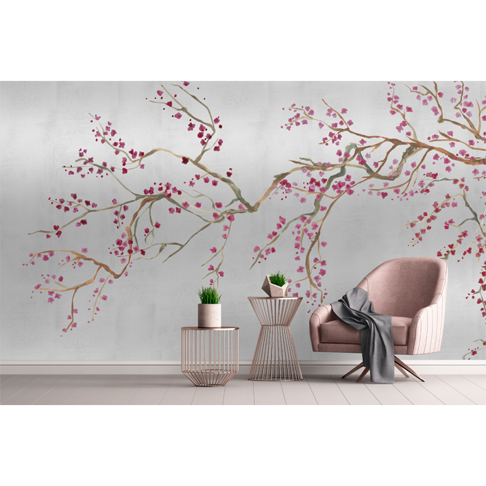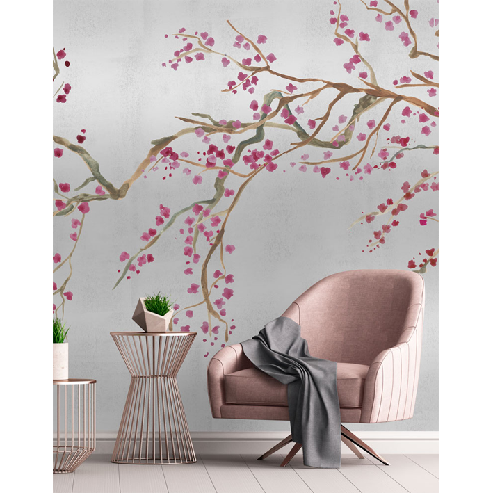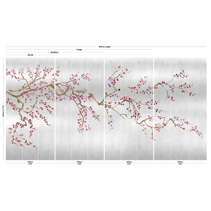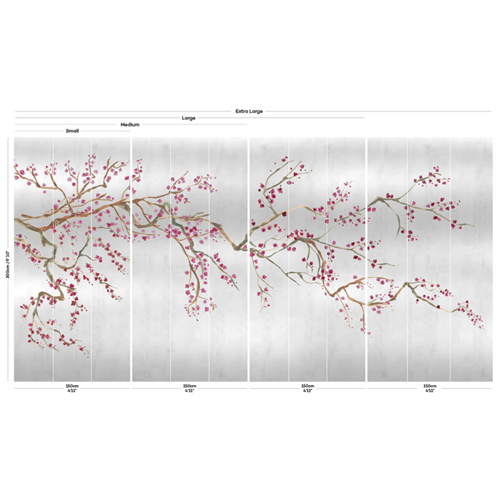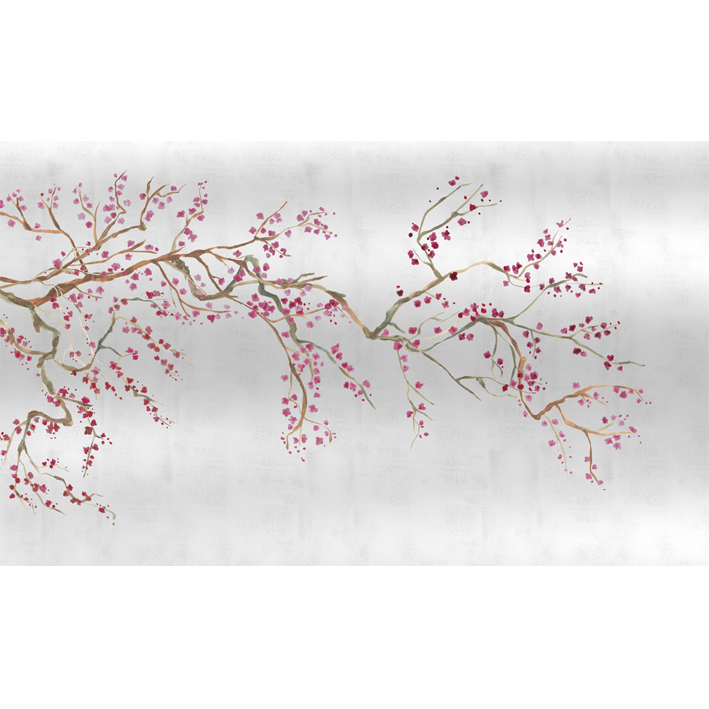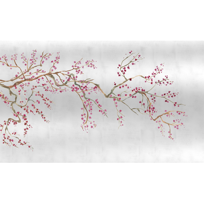 Feel the sparkle of this dashingly beautiful silver cherry blossom wallpaper mural. Set against a lightly distressed silver metallic background are stunning cherry blossoms and nut brown branches combine to make a truly spectacular, chinoiserie-style, silver cherry blossom wallpaper mural.