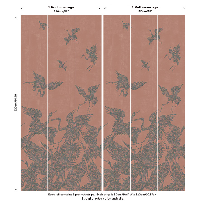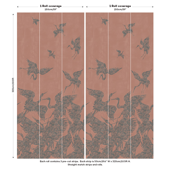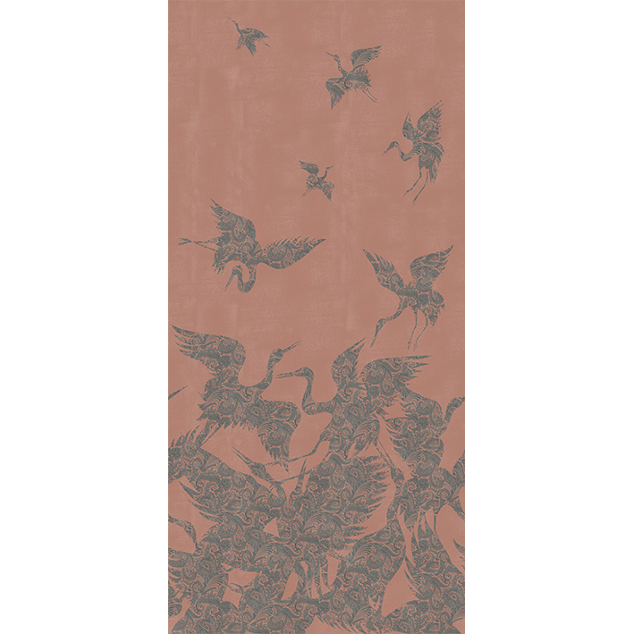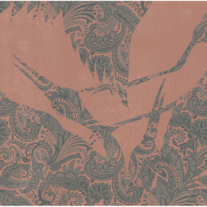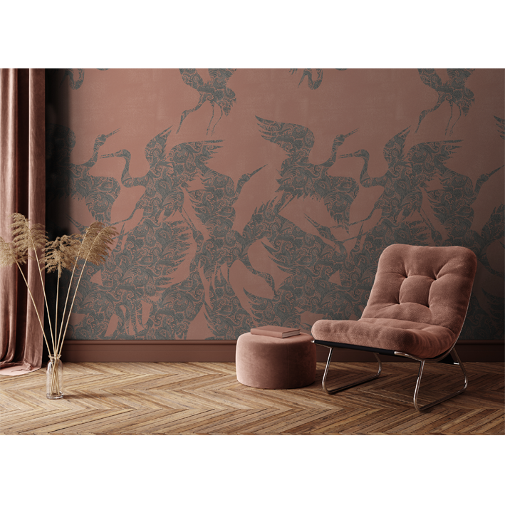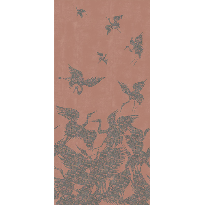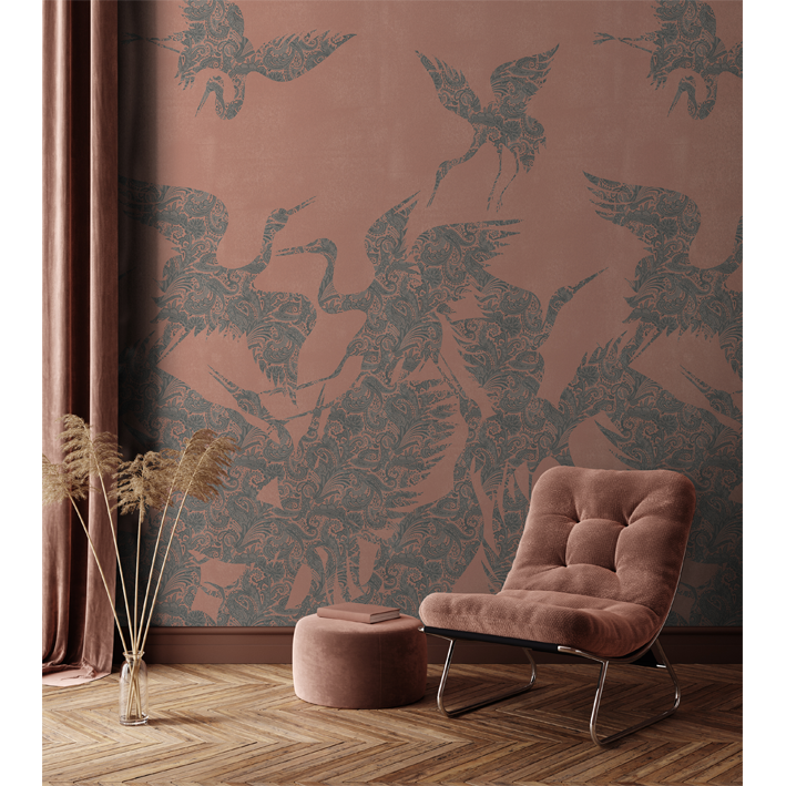 This beautiful pink & blue heron wallpaper captures the energy and a beauty of a flock (known as a ‘swoop’) of herons as they take flight. Each heron is picked out in a detailed and intricate paisley pattern, whilst a lightly distressed background enhances the design. This stunning wallpaper will particularly suit design projects that are looking to introduce a chinoiserie wallpaper feel.