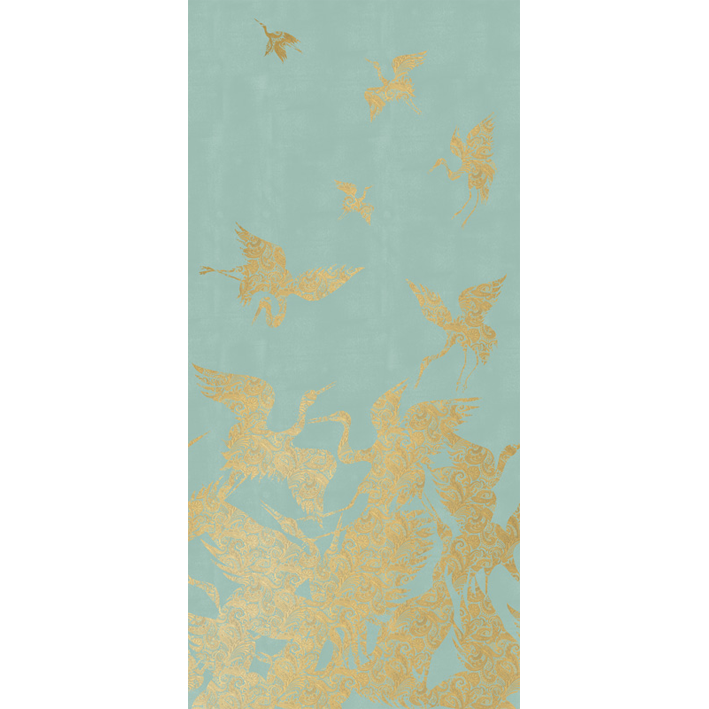 This luxury green and gold heron wallpaper captures the energy and a beauty of a flock (known as a ‘swoop’) of herons as they take flight. Each heron is picked out in a detailed and intricate gold metallic paisley pattern, whilst a lightly distressed background enhances the design. This stunning metallic wallpaper will particularly suit design projects that are looking to introduce a chinoiserie wallpaper feel.