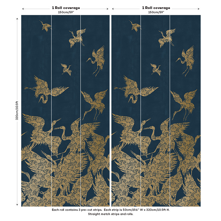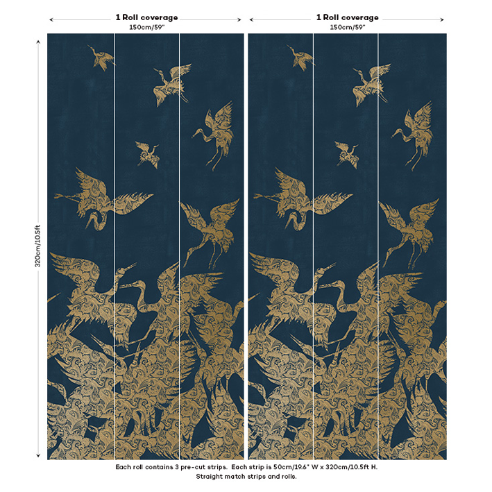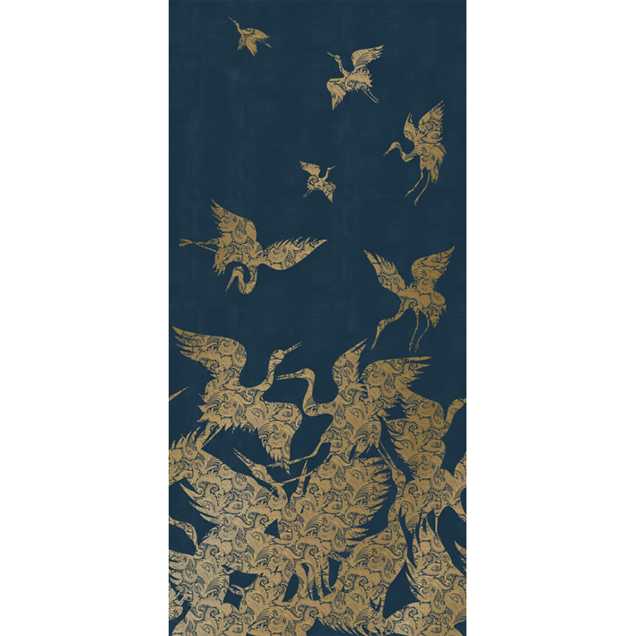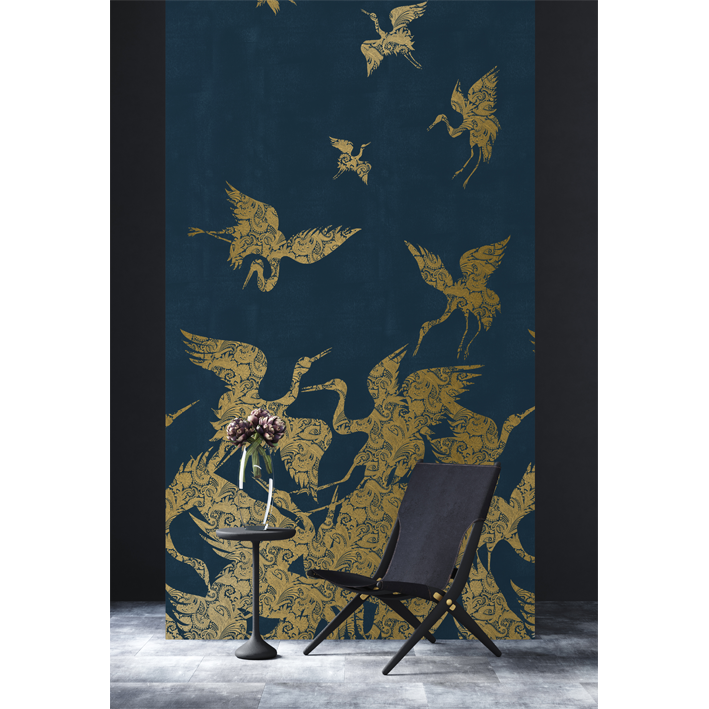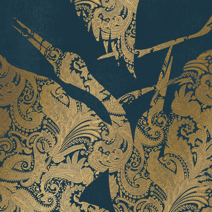 This luxurious blue & gold heron wallpaper captures the energy and a beauty of a flock (known as a ‘swoop’) of herons as they take flight. Each heron is picked out in a detailed and intricate gold metallic paisley pattern, whilst a lightly distressed background enhances the design. This stunning metallic wallpaper will particularly suit design projects that are looking to introduce a chinoiserie wallpaper feel.