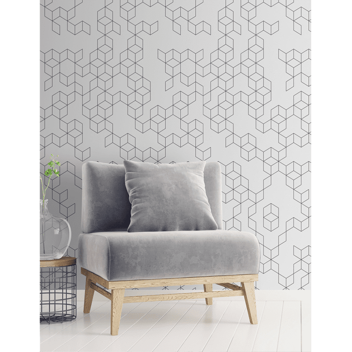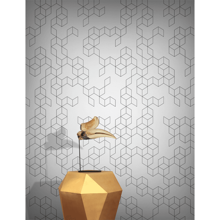 Artist Florent Bodart created the Keziah Night wallpaper, which has been inspired by vintage tiles and reimagined in a modern style. The grey modern geometric wallpaper has a light grey background with darker grey geometric shapes playing on top. It has a sleek feel that fits a variety of rooms.