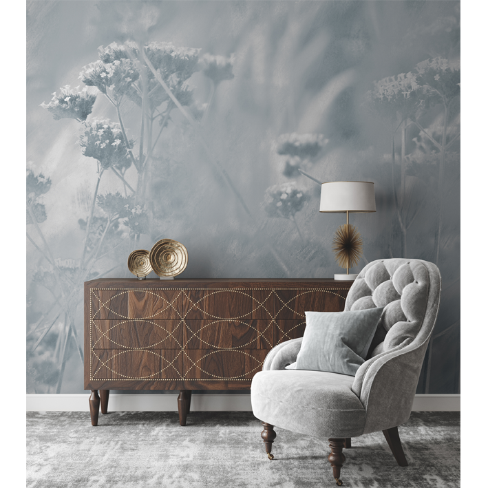 Verbena offers a glimpse of a garden full of flowers when the sun is starting to set and the moon is waiting to come out. This mural mixes blues with whites to set a scene that looks radiant in a living room or bedroom. The blue & white abstract floral wall mural creates a natural look inside and creates a space for pure relaxation.