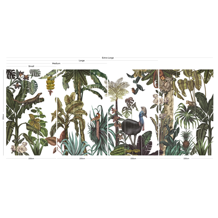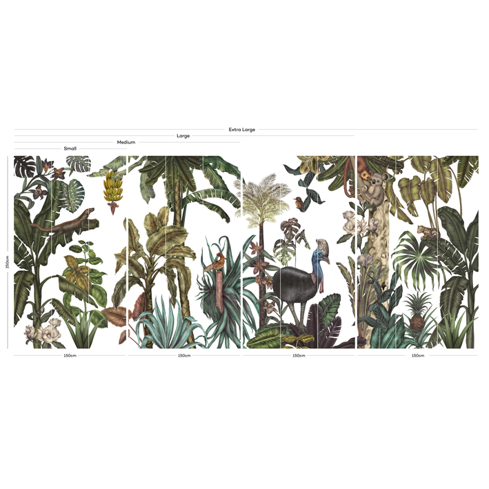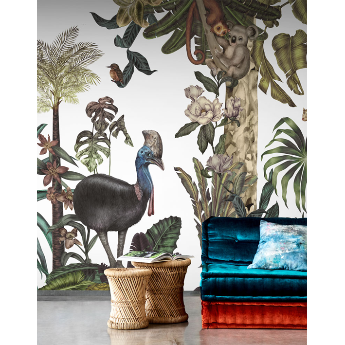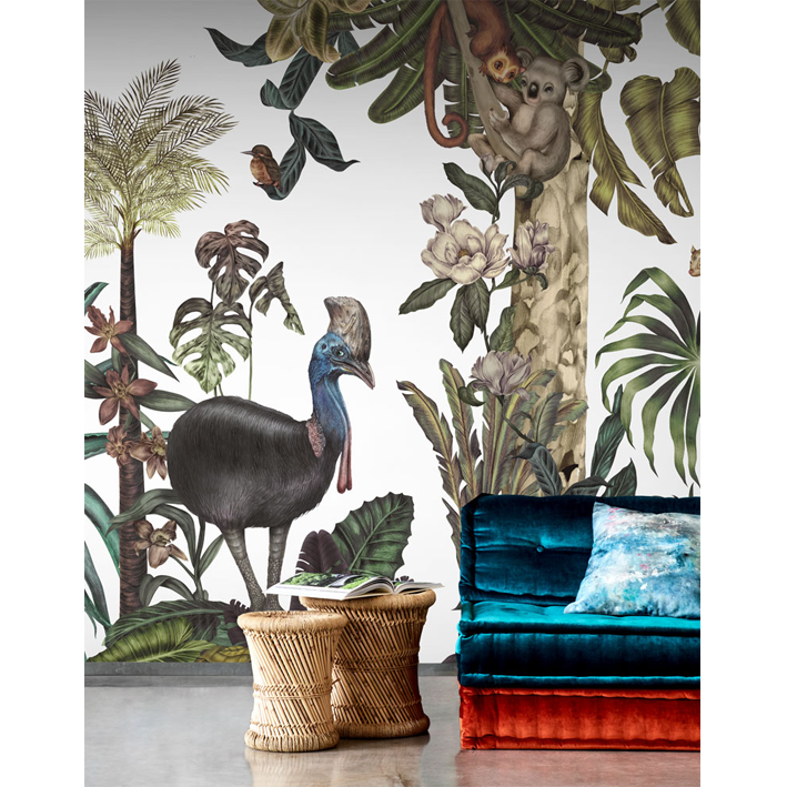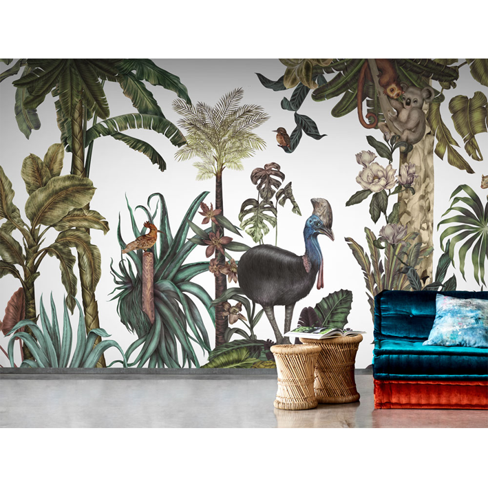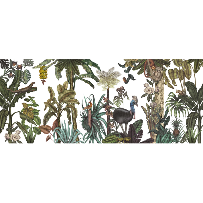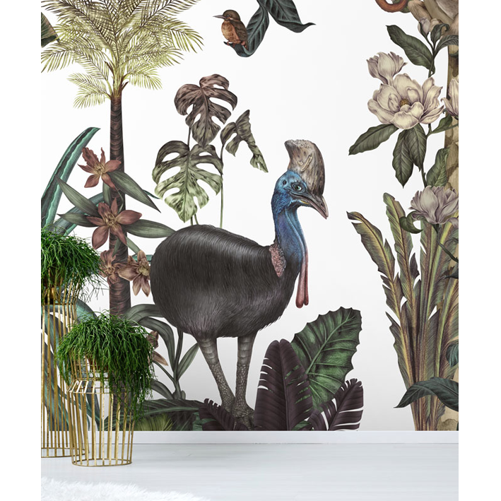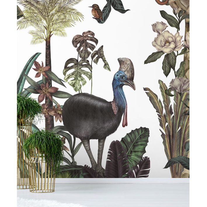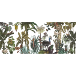 Jungles are the most popular theme in Karina’s work. This jungle wallpaper mural, with its rich tropical world full of exotic flora and fauna are created with mixed media technique to create a lush landscape featuring exotic birds, animals and flowers.