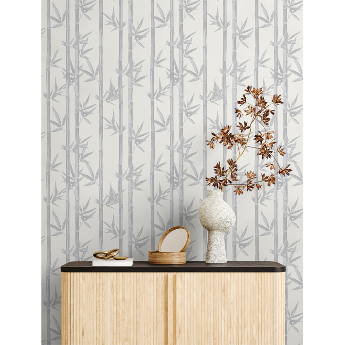 With grey tropical bamboo wallpaper, you can create an understated feature wall or adorn all four walls of a living room, dining room, or other space. This designer wallpaper is created with artistic brushstrokes that add texture to any room in a modern home. The bamboo is a gorgeous shade of silverish-grey against a backdrop of cream and lightens up a space.