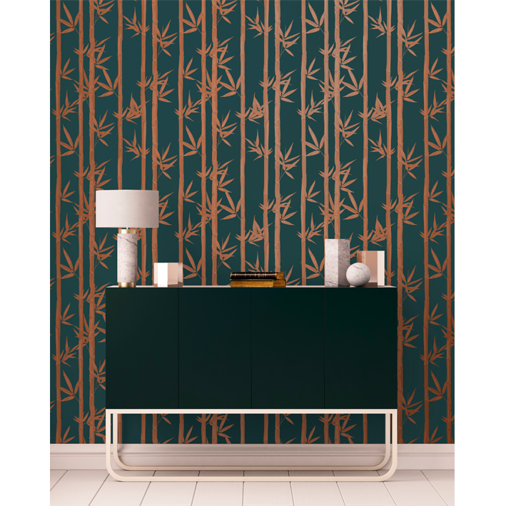 Intricate brushstrokes make up the leaves and stalks of the plants on this teal & bronze metallic bamboo wallpaper. The luxury wallpaper has an intense green background with metallic bronze stalks that create a natural environment without even leaving your home. Try it in areas of relaxation like living rooms, bathrooms, or dining rooms. It also creates a soothing space for sleep in bedrooms.