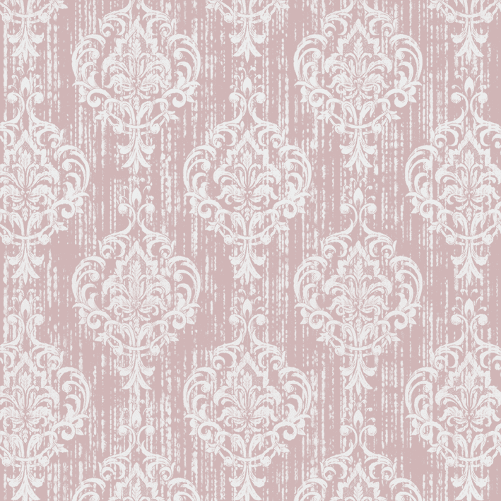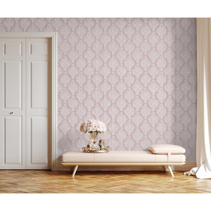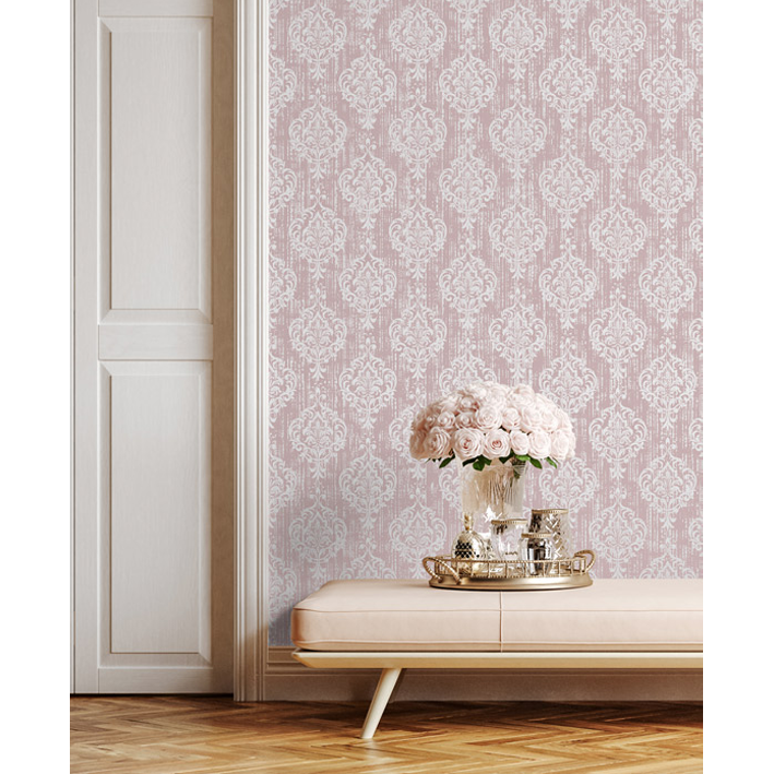 With this pink & silver distressed damask wall mural, your living or dining room will evoke a luxurious feel with a touch of vintage appeal. The Wentworth wall mural has a brocade pattern against a flat background but incorporates metallics to add to the elegance of the mural.