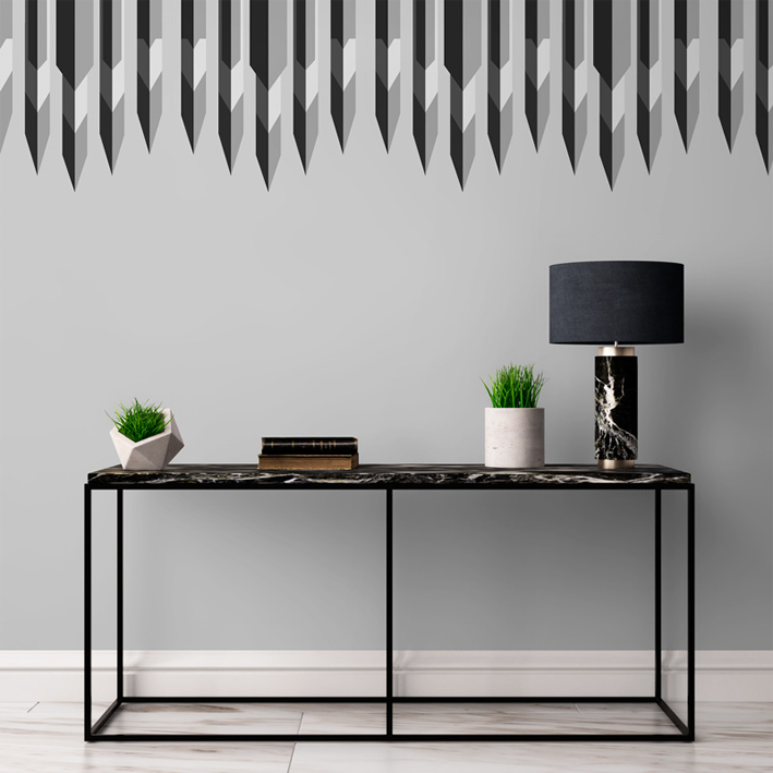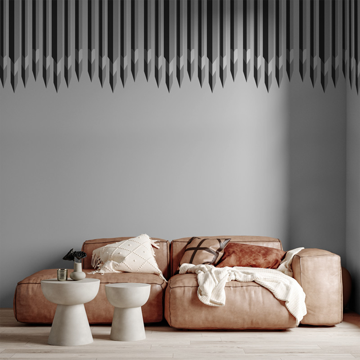 Created by artist Tim Muddiman, Angular Walk is a wallpaper with a unique contemporary aesthetic. The angular striations that descend from the design draw our eyes upwards creating a striking focal point within a room. The graphic geometric shafts descend towards a soft grey background, allowing any furniture to sit comfortably within the design. Choose this grey geometric stripe wallpaper for a modern bathroom interior.