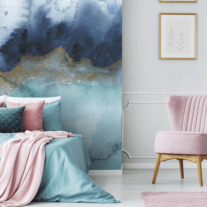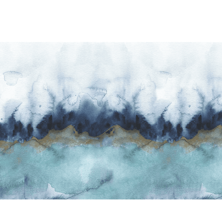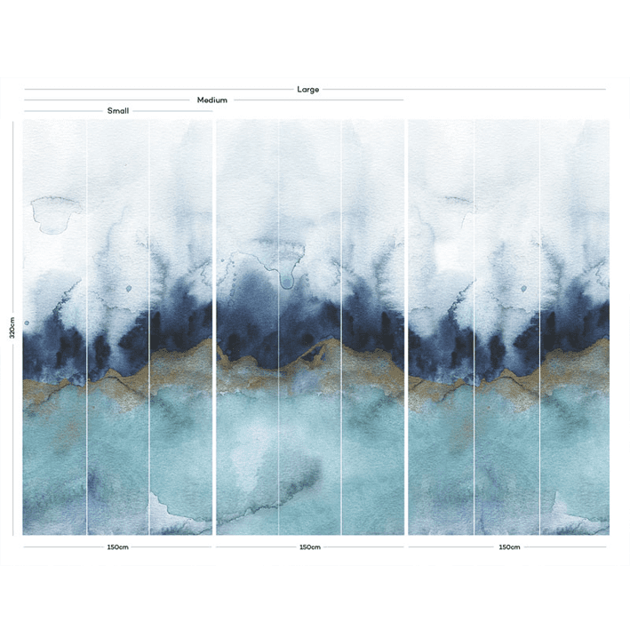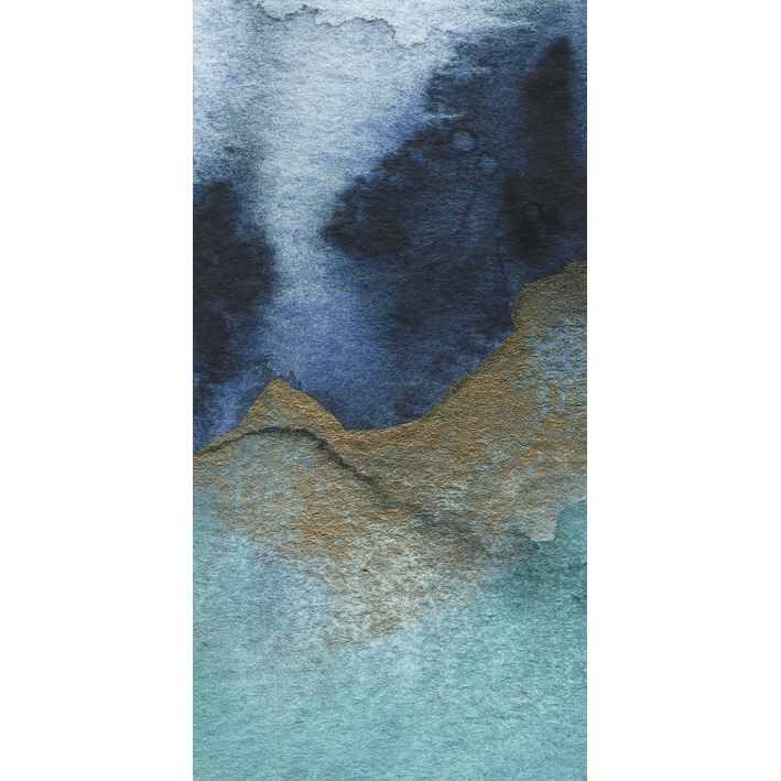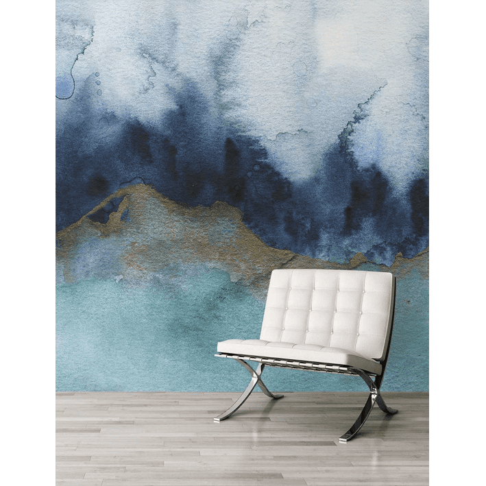 Mystic is a gorgeous wallpaper mural in an abstract style designed by painter Jen Merli. The teal & grey abstract wallpaper mural incorporates intricate detailing in gold that flashes across the watercolour background. The colours press against each other to create a backdrop that could be seen while standing on the beaches of the sea.