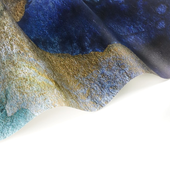 Mystic is a gorgeous wallpaper mural in an abstract style designed by painter Jen Merli. The teal & grey abstract wallpaper mural incorporates intricate detailing in gold that flashes across the watercolour background. The colours press against each other to create a backdrop that could be seen while standing on the beaches of the sea.