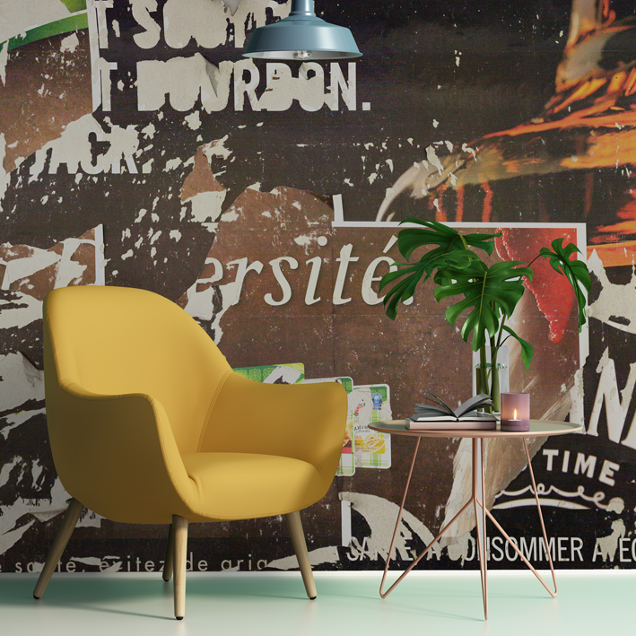 Remnants of advertisements ripped out, worn out by time. Only a few words remain, a few snippets of brown images studded with white. All this to become an abstract panoramic wallpaper with a great aesthetic.