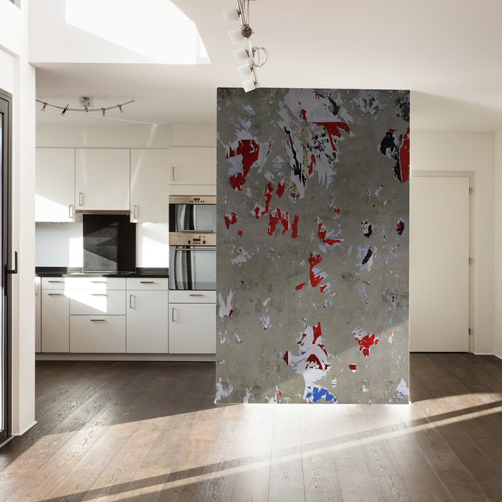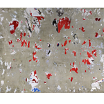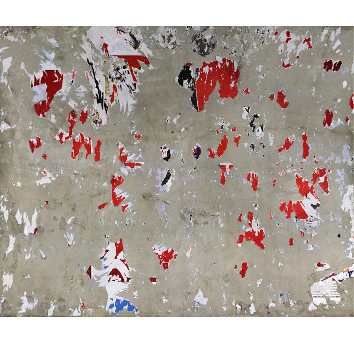 On a mastic-coloured cement wall dance small pieces of bright red paper, like butterflies landing on white flowers. Remnants of advertisements torn away, worn out by time, this gives a joyful, abstract and modern panoramic wallpaper.
