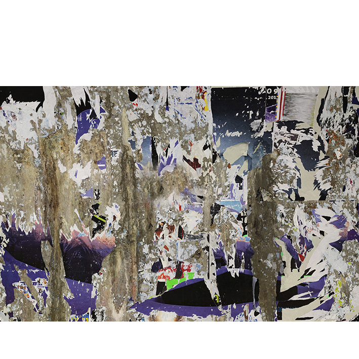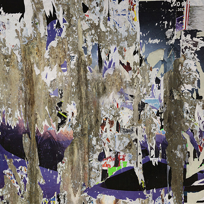 Remnants torn from the "advertise" of another era. The seventies maybe? On a stone wall worn out by time remain touches of brightly coloured paper like brushstrokes on an abstract work. Purple, fluorescent green, white. A mix of periods for an ultra-modern panoramic wallpaper.
