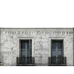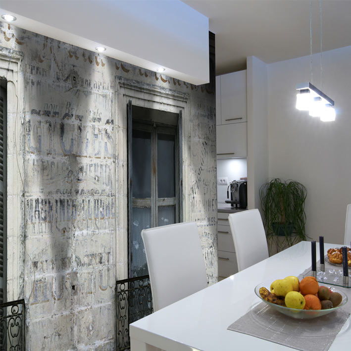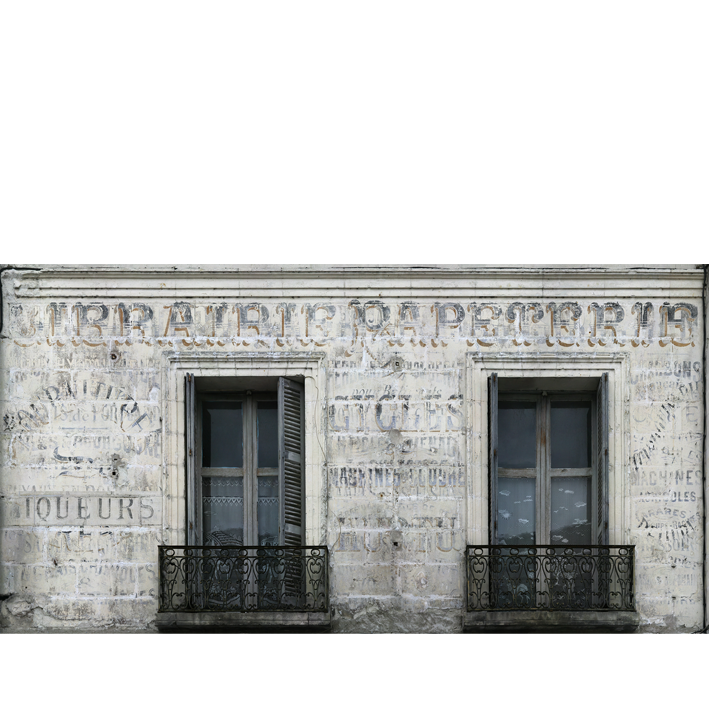 A few traces from another time of these magnificent typographies painted by hand, with patience and genius. Bluish traces on grey wall and putty. What a softness for this unforgettable panoramic wallpaper!