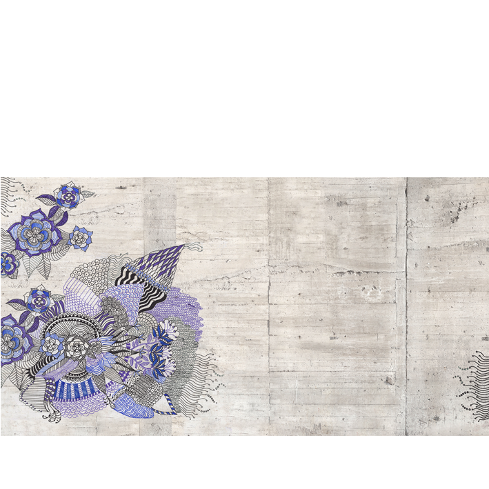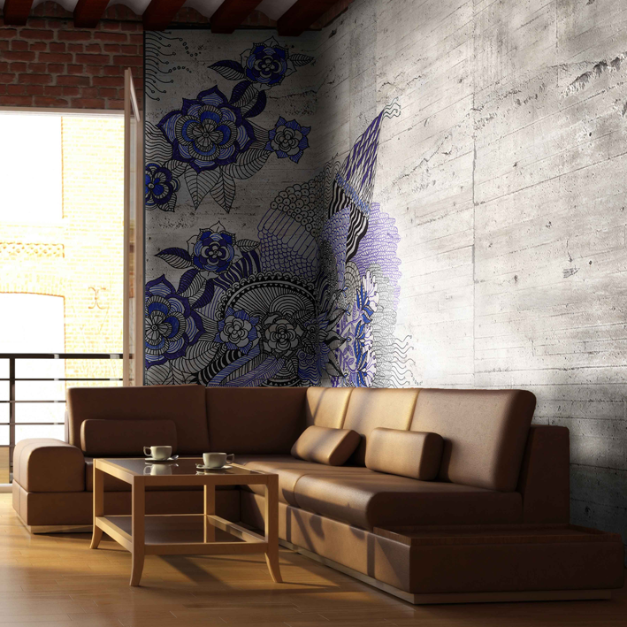 African paintings of Tiébélé, Hindu mandala, azulejo from Portugal?. This panoramic wallpaper in various shades of blue and purple, on a concrete wall, makes us travel anyway!