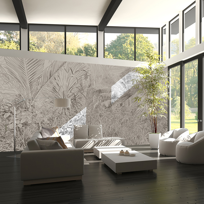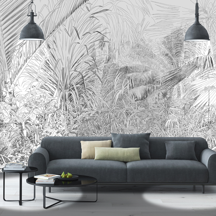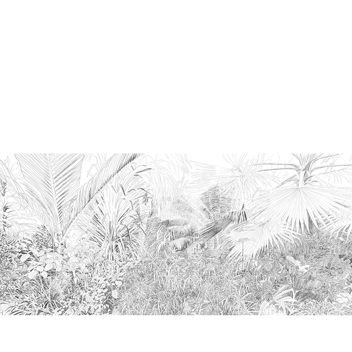Ultra meticulous and delicate drawing of a tropical forest, in black pencil on a white background. For an even more realistic panoramic wallpaper, it can be coloured by the artist, just ask!