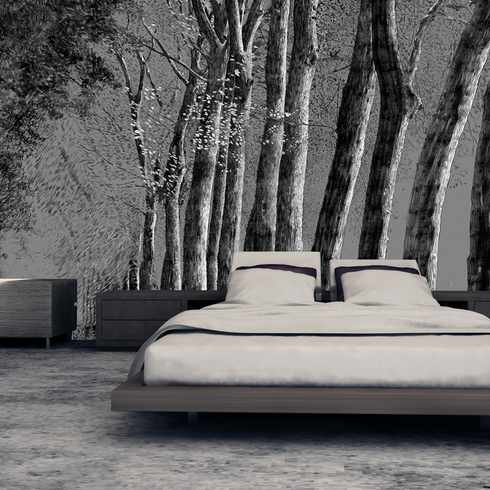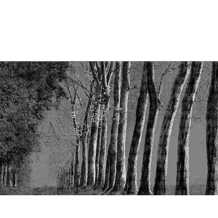 This panoramic wallpaper is a symbol of the artist's patience! Drawing with black and white pencils, branch by branch, leaf by leaf, on grey paper, of a walk in the forest, in the moonlight. Even the wind, in the distance, has been drawn!