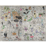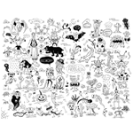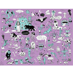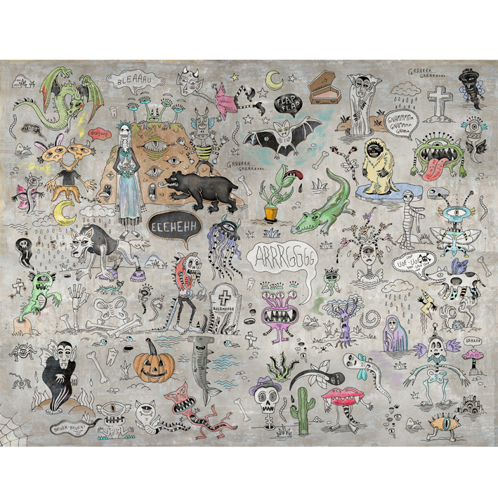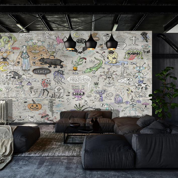 Grrrr! Those nasty monsters are doing everything they can to horrify us! Graphic on a concrete wall, tinted in pastel colors, this is a rather funny panoramic wallpaper! Not even afraid!