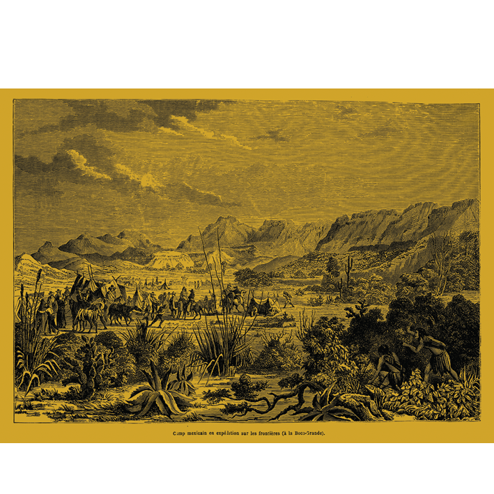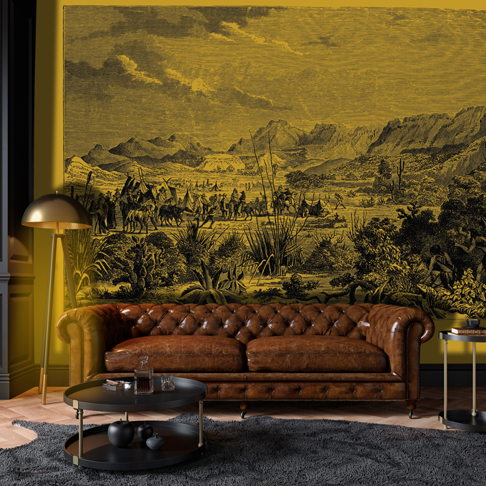 Souvenir of a trip to Mexico in the 20's... An old engraving, printed on ochre paper, the color of the sand of the Sonara desert. With this panoramic wallpaper, the piece is unique!