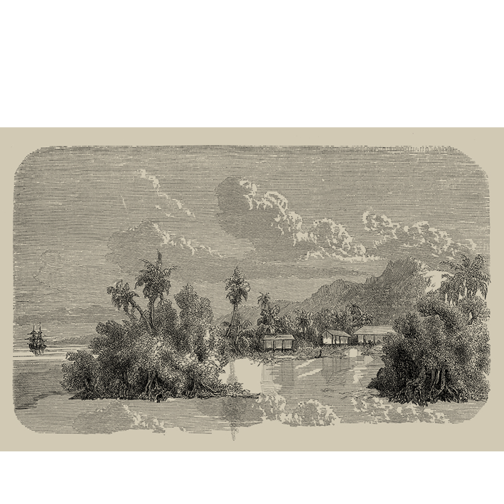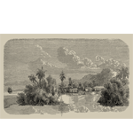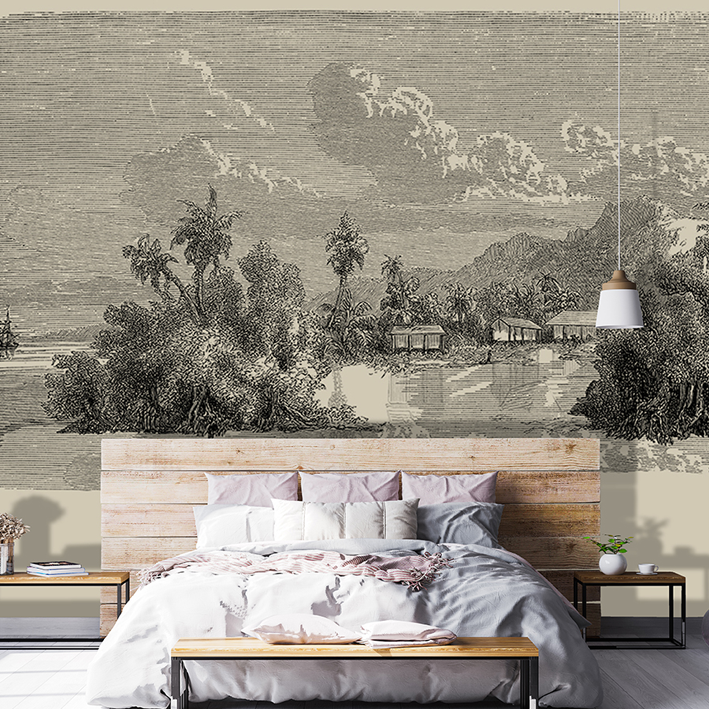 Dreaming... Dreaming of going far away, to a desert island. Palm trees, blond sand, warm sea, just a hut for shelter and peaceful days... Here is a panoramic wallpaper from an old engraving printed on a bistre background. sand colour. What happiness!
