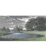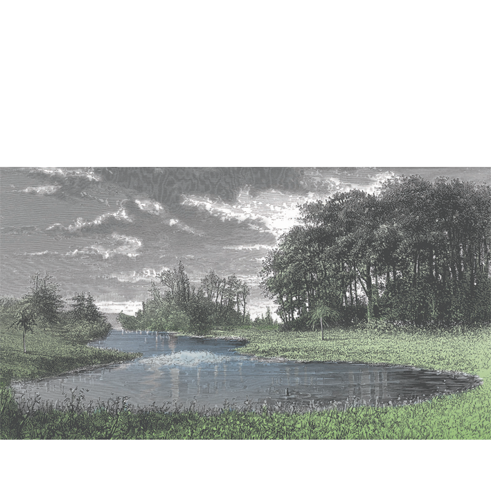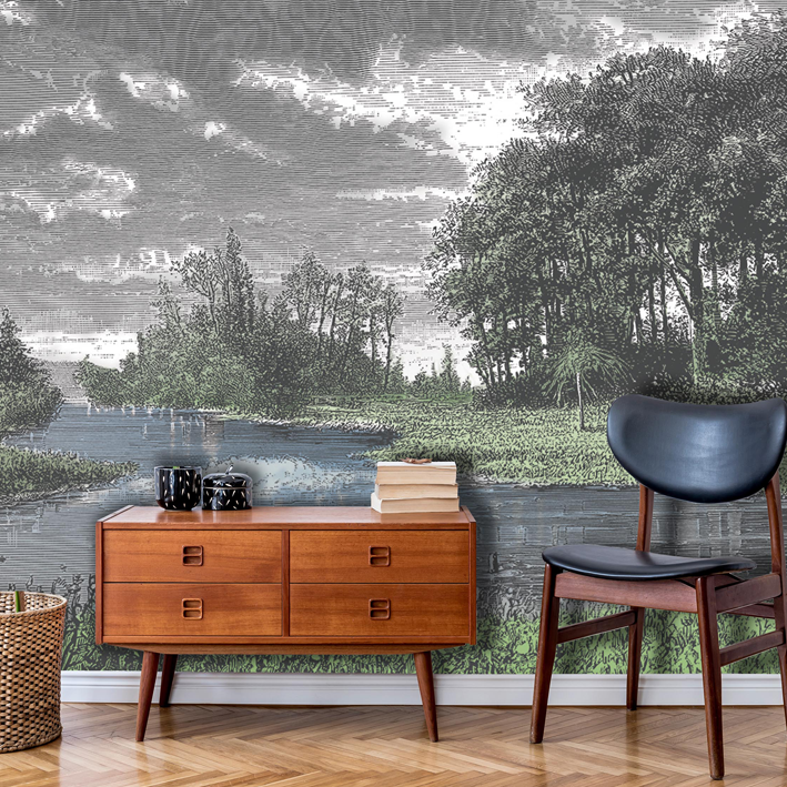 19th century engraving of a landscape in various shades of grey and celadon green. Ancient drawing modernised by an aerial colour scheme. A real work of art in your interior!