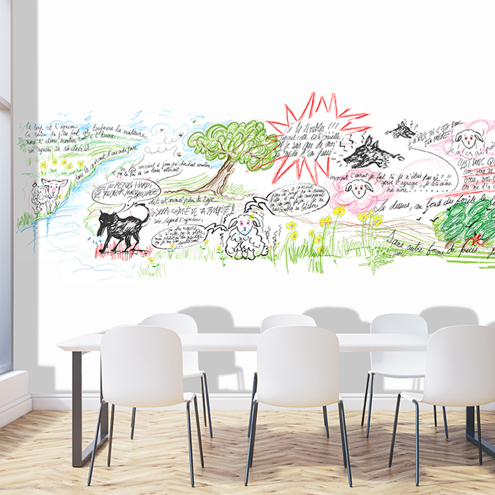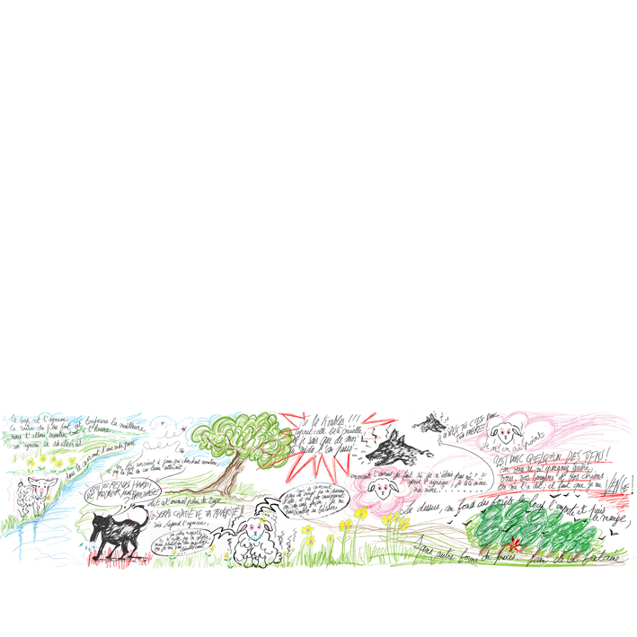 This panoramic wallpaper, it looks like it was drawn by children, directly on the wall, just like that, with coloured pencil. This is the Wolf and the Lamb. All the fables of the Fountain can be illustrated in this way. On request. Nice, isn't it?