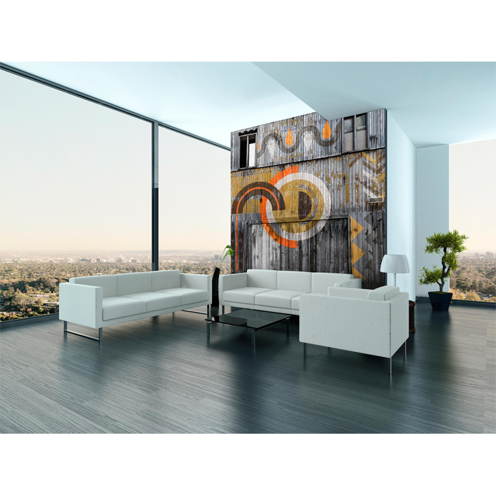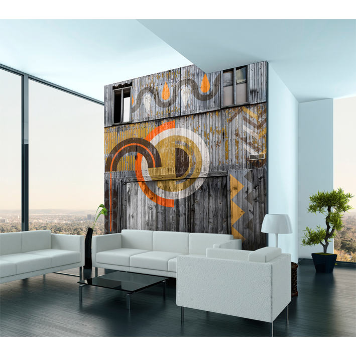 On a background of a wall with magnificent century-old boards were painted, long ago, geometrical shapes with unknown meanings. Ochres, earth of fire, browns and oranges, they were discovered perhaps in the depths of Mexico. Result: a confusing panoramic wallpaper!