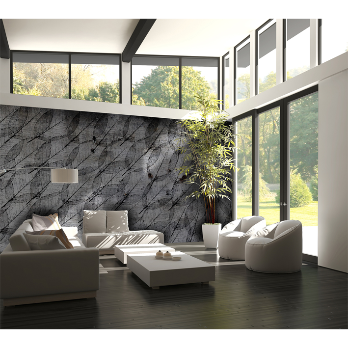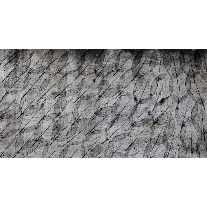 Delicate charcoal-black hydrangea leaves, fossilized in a concrete wall, cross each other in transparency. Dark colours and the airy effect of artsanal lace for this panoramic wallpaper!