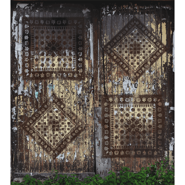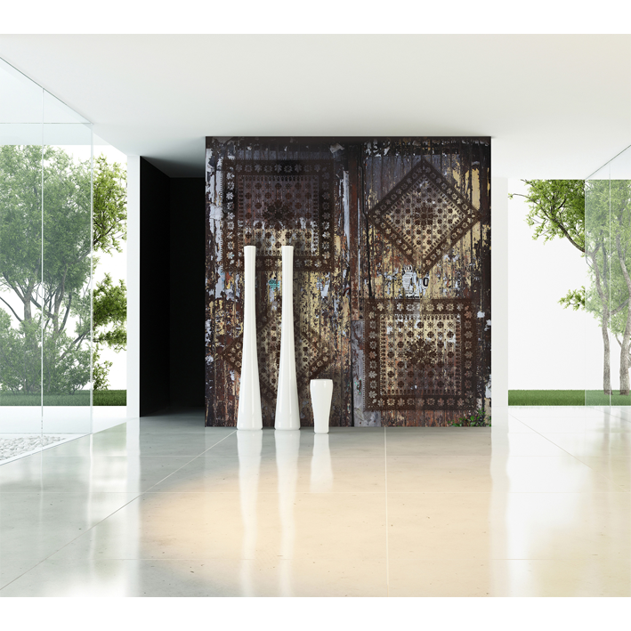 Pyrography in the rough and faded wood of a barn door, delicate patterns of old carpets, probably Berber. What a beautiful combination of opposites for this unexpected panoramic wallpaper!
