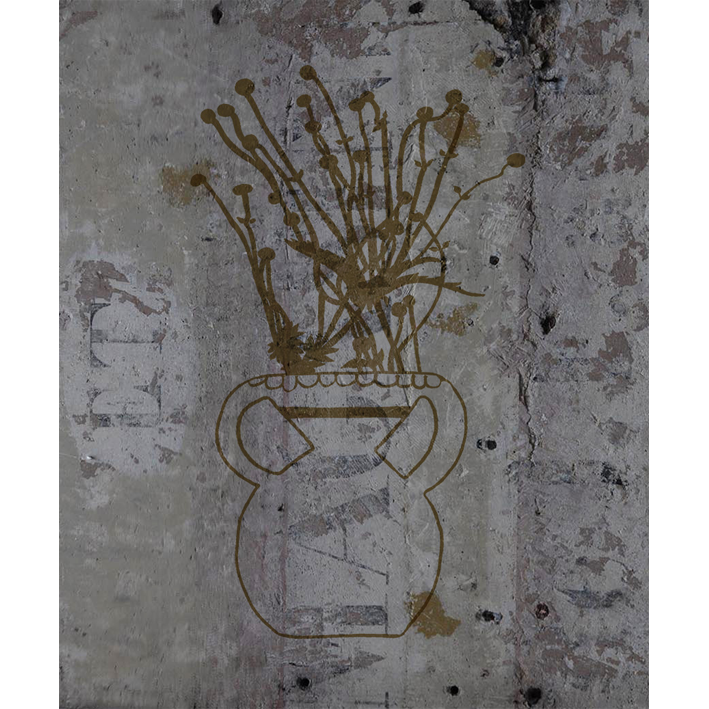From an "advertisement" painted more than a century ago, almost completely erased, there remains this small vase of Japanese anemones, without petals, for a very decorative panoramic wallpaper.