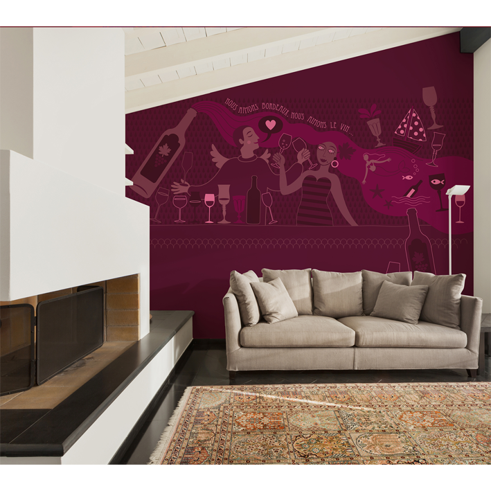 Festive silhouettes in multiple variations of purple and burgundy. A graphic and contemporary panoramic wallpaper. It's the touch of fluorescent pink that makes the difference, and the little heart that goes boom boom!